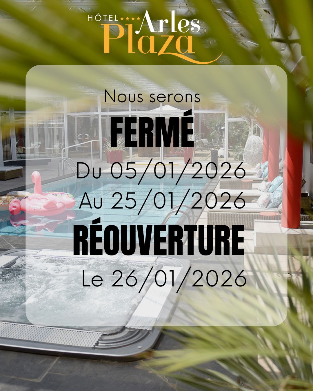 L’Hôtel Arles Plaza **** dispose également d’une piscine chauffée accessible tout au long de l’année et découverte l’été. Et pour ravir votre séjour, un espace bien-être avec sauna finlandais et spa, un espace dédié aux enfants, une borne d’arcade, un billard, un babyfoot et une salle de fitness.